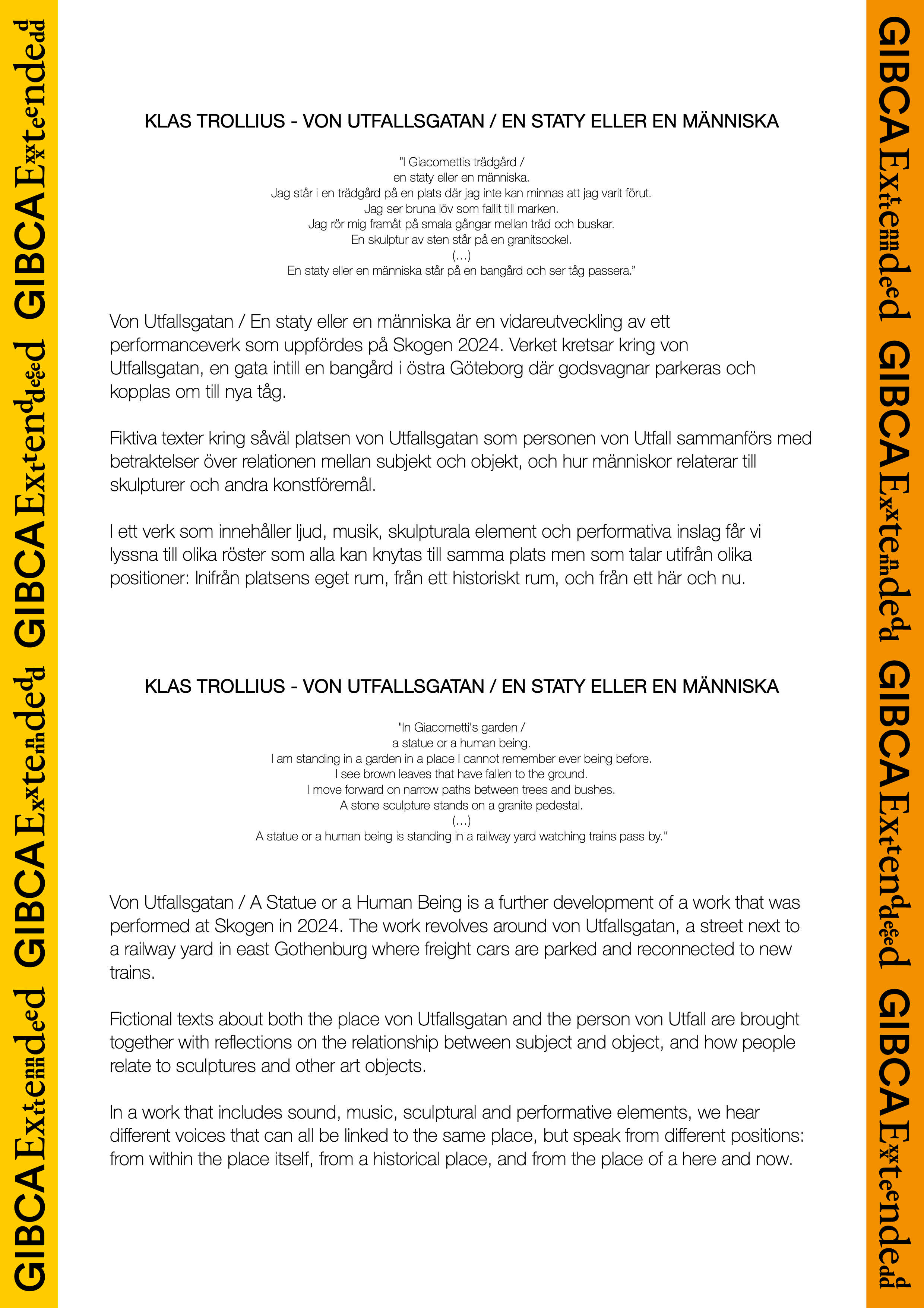 Utställningen är en del av GIBCA Extended som är både ett nätverk och ett publikt program som samlar samtidskonstscenen i hela Västra Götaland. För varje upplaga skapar enskilda konstnärer, gallerier, konsthallar och